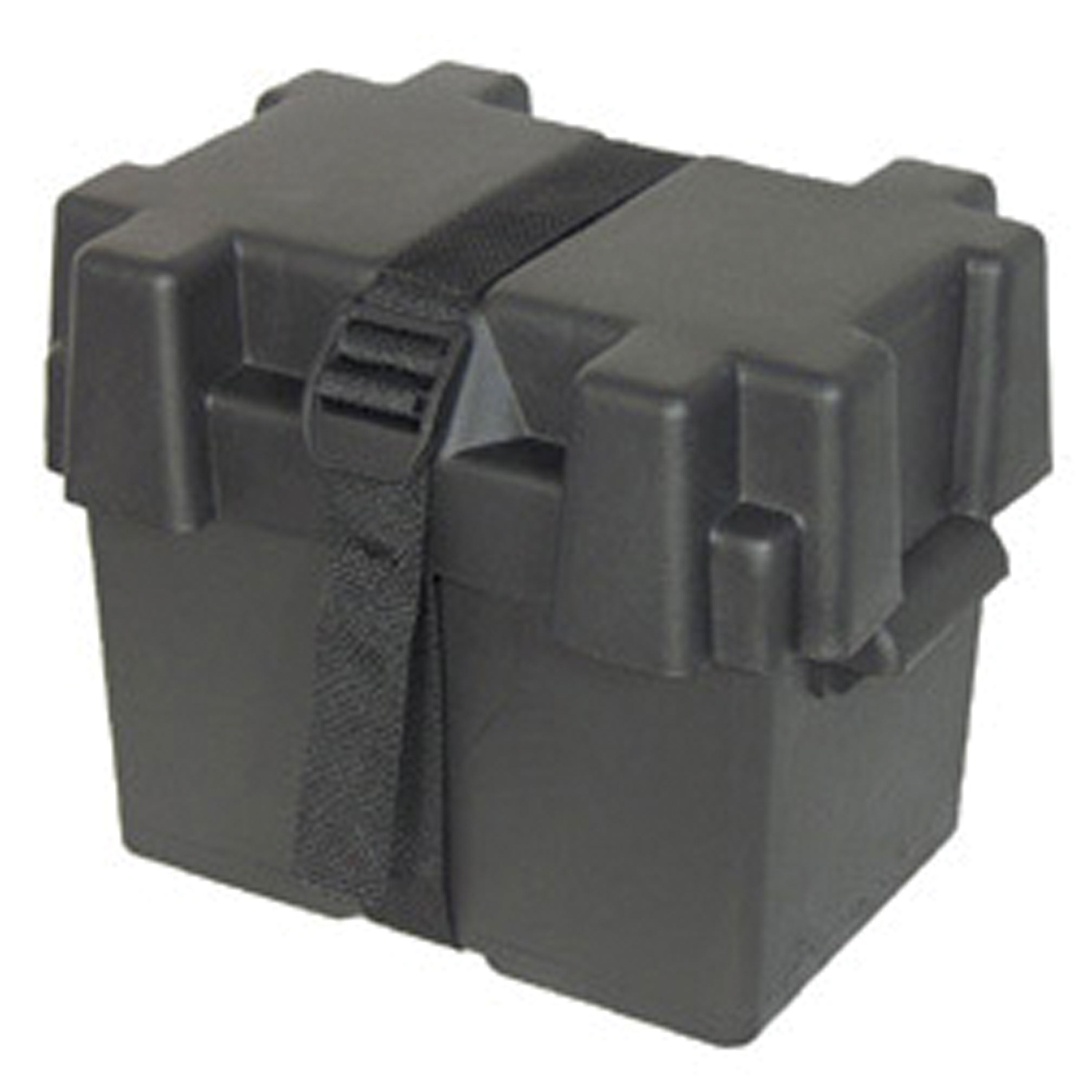 New larger capacity! Vented black battery box for Series 27 batteries. (10-1/2" maximum height). Battery boxes meet ABYC Standard E-10 and U.S. Coast Guard Specification Number 183.420 as an OEM-installed battery hold-down system. Polypropylene construction for total acid resistance. Hold-down straps resist 350 pounds of force, nearly four times the USCG requirement. Battery Boxes are drop tested in temperatures ranging from -20 °F to +120 °F. Mounting hardware is included.