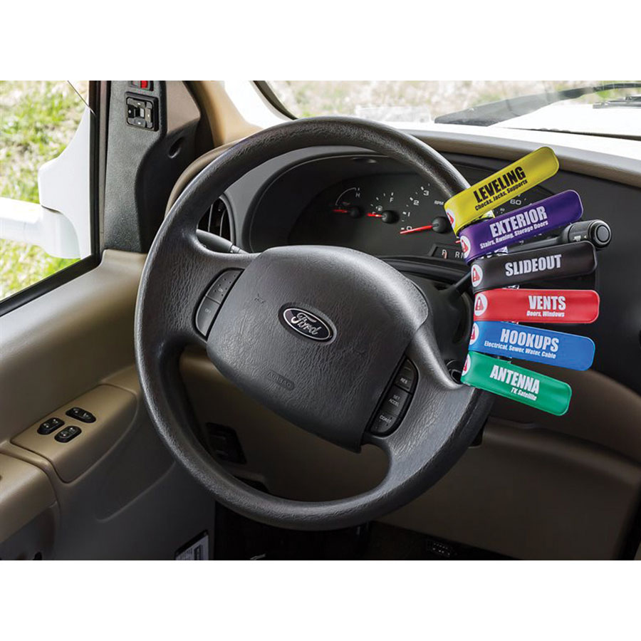 Camco's RV Steering Wheel Check Bands help remind you to perform various RV tasks before you travel to prevent avoidable damage to your rig. Made of PVC and felt, they wrap securely around your steering wheel. Simply snap the band onto the wheel to remember a specific task and remove when it's completed. The pack includes (9) steering wheel check bands (7 pre-labeled and 2 blank); the (2) blank reminders are customizable.