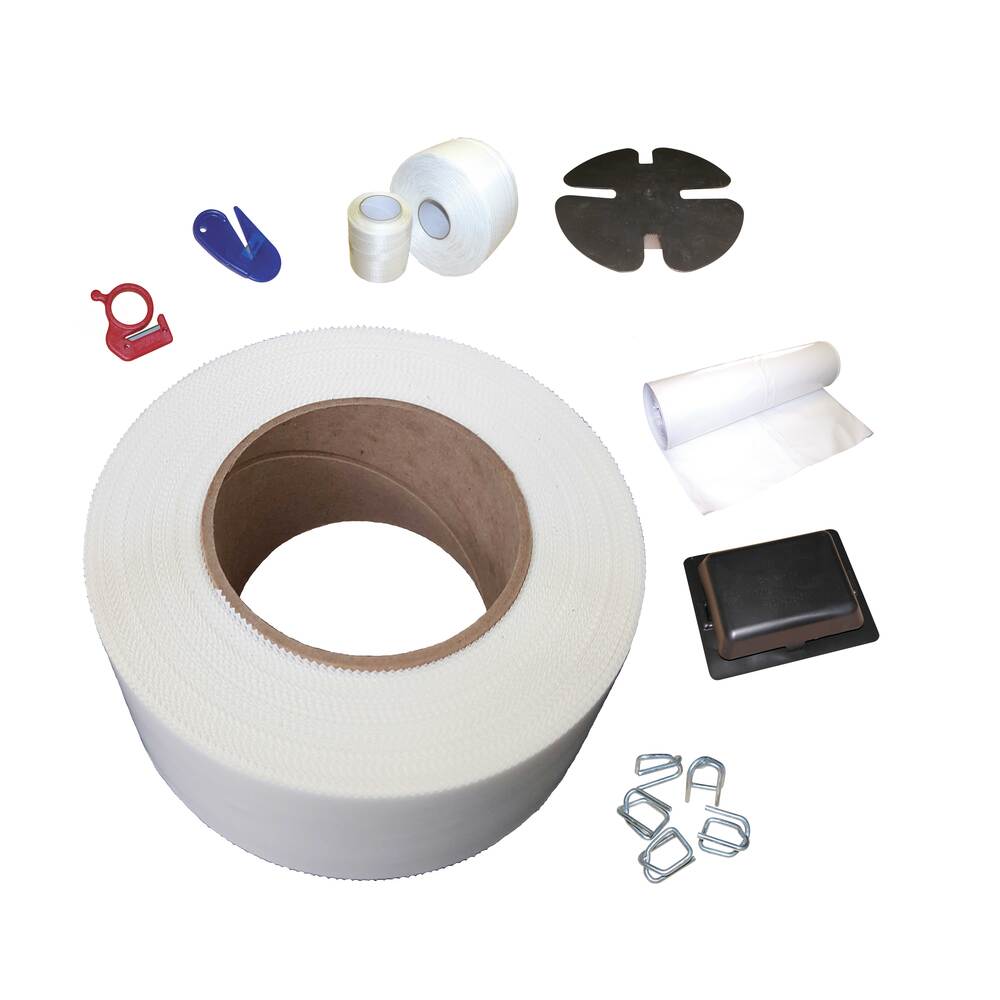 The Dr. Shrink DS-SWK Shrink Wrap Kit is designed for runabouts and pontoon boats up to 24' in length. Each kit includes (1) roll of 17' x 31' white 7-mil shrink wrap, (1) roll of 2" x 180' white heat shrink tape, (1) roll of 3/4" x 300' woven cord strapping, (3) end caps for support posts, (6) individual 3/4" buckles, (1) ring cutter to cut strapping, (1) disposable film knife to cut shrink wrap, and (4) weather-tight self-adhesive vents. Installation requires a propane fired heat tool, ladder, hand saw, 2" x 4" support poles, and a propane tank (not included). Note: will not fit runabouts with wakeboard towers or pontoons over 8' wide.