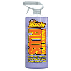 Formulated with a Brazilian Grade-A white carnauba wax. Quickly and effectively eliminates hard water spots while leaving a waxed and UV protected surface. Use only when water spots persist. NOTE: Although this product contains wax it should never replace a true detail product like our Quik Clean & Wax. When used as directed, Water Spot Plus eliminates the need for Ducky's more aggressive formula in the Original Ducky Water Spot Remover. For neglected or water spots exposed to excessively hot weather conditions it may be necessary to revert to Ducky Original Water Spot Remover, it's ability to handle the most aggressive spots has it made it a staple item for boaters in the know!