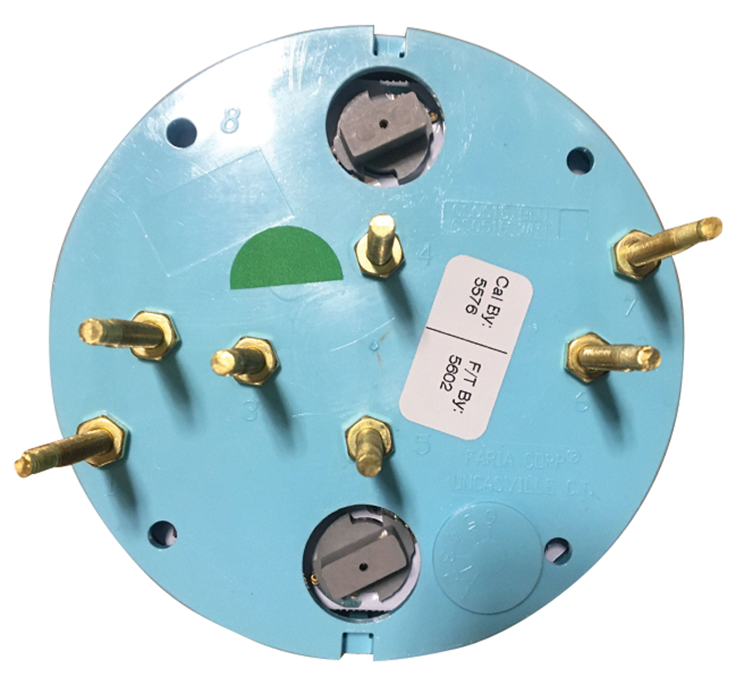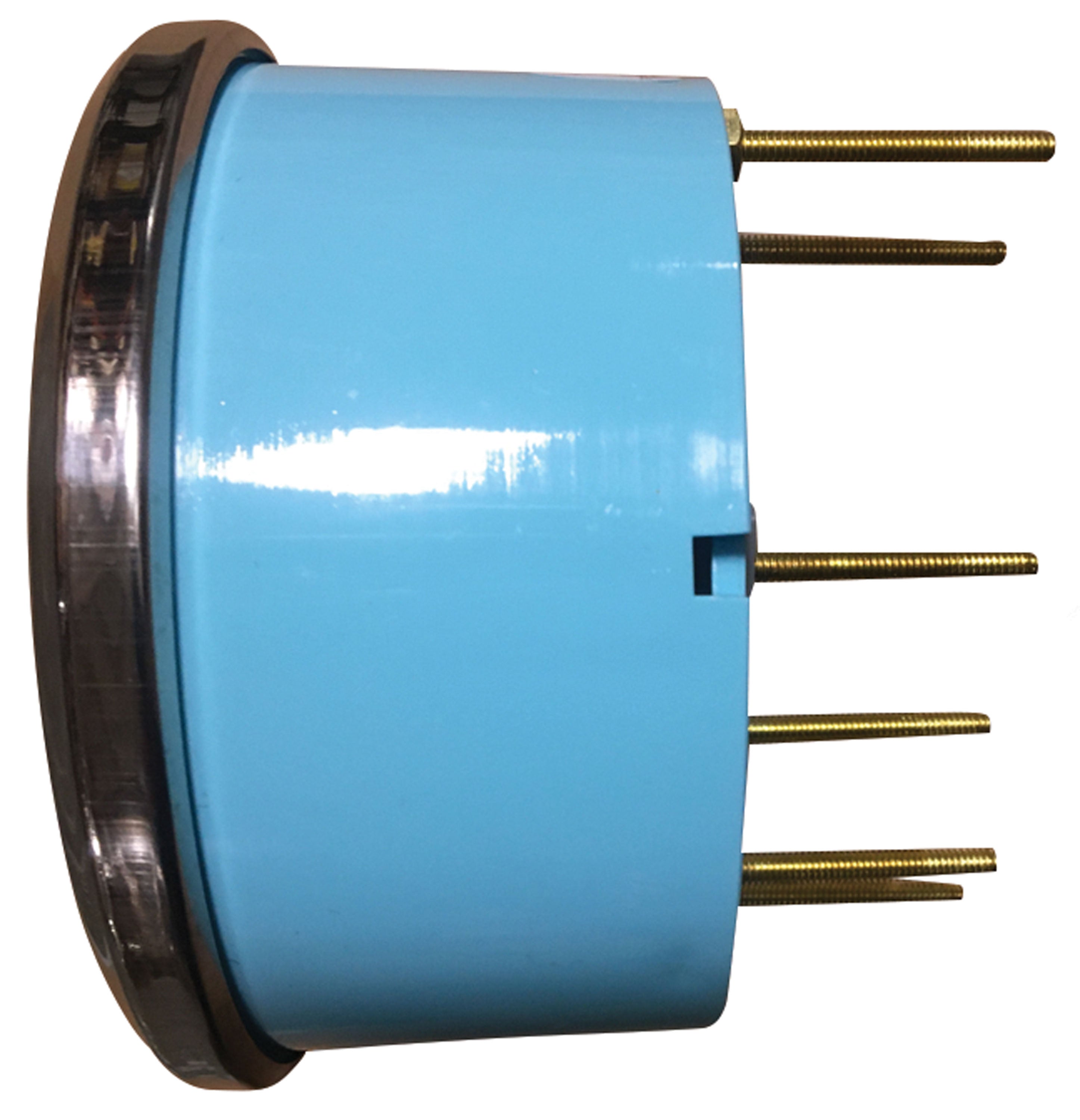 Perimeter-lighted black dial with stylish blue and white graphics, polished stainless steel bezel, contoured White pointer, and domed glass lens.