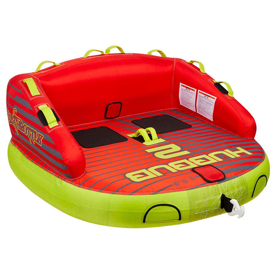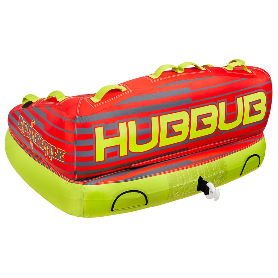 Hubbub features 2 rider, 65 in. x 66 in. tube, 340 max weight. 2-way towing points for multiple riding styles, Tow from the front for a seated secure ride or tow from rear in kneeling position. 10-comfort grab handles, EVA seat pads for kneeling and sitting comfort. Rugged and durable nylon cover.
