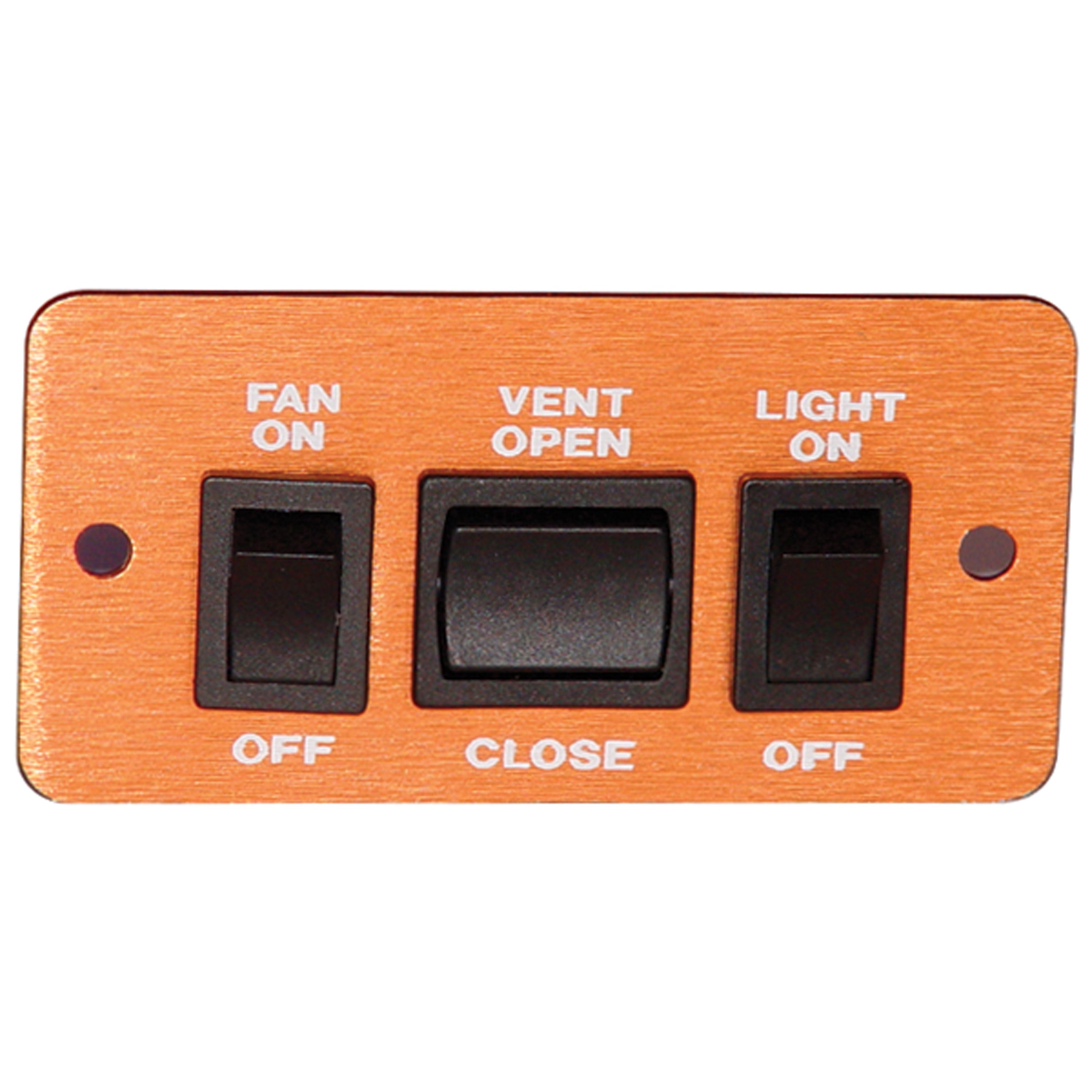 Power Vents Power Lift and Switch Acrylic UV-resistant translucent lid conforms to Federal Motor Vehicle Safety Standard (FMVSS) No. 205 glazing materials. Hand crank opens and closes the lid securely. Vent with 12 volt light utilizes a translucent plastic lens and four 3 Watt low voltage lights. Vent with power lid lift uses 12 Volt DC motor operated by a convenient remote switch. Power lift eliminates need for hand crank in accessible applications. White base with 12V Fan, Light, and power lift. Includes Switch.