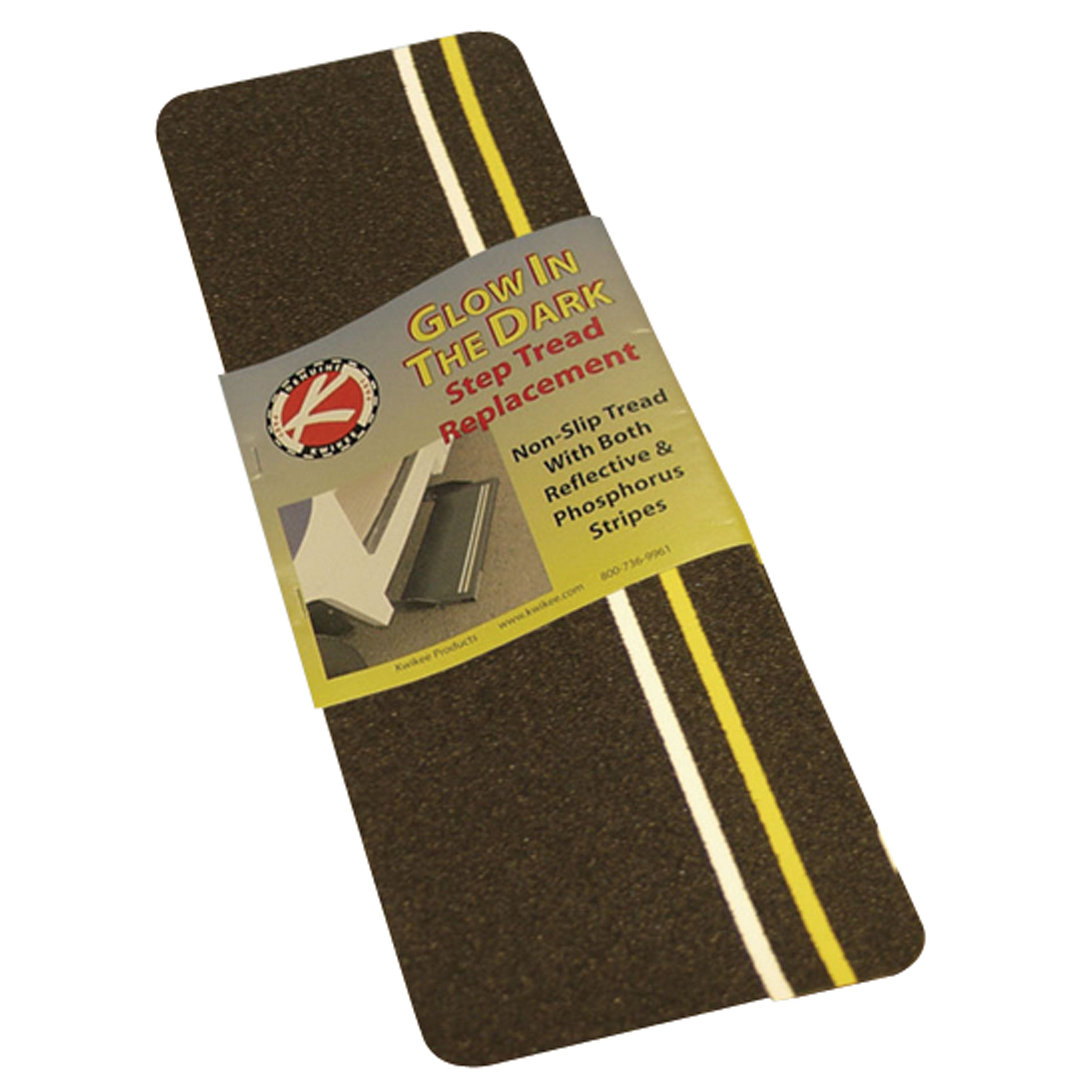 Kwikee Glow in the Dark Step Treads are the perfect compliment to quality Kwikee steps. The Glow in the Dark version uses two different safety technologies, a reflective stripe and a night glow phosphorus stripe. The result is a glowing step that lights the way well into the night. Dimensions: 6" x 21". Pack of 1.