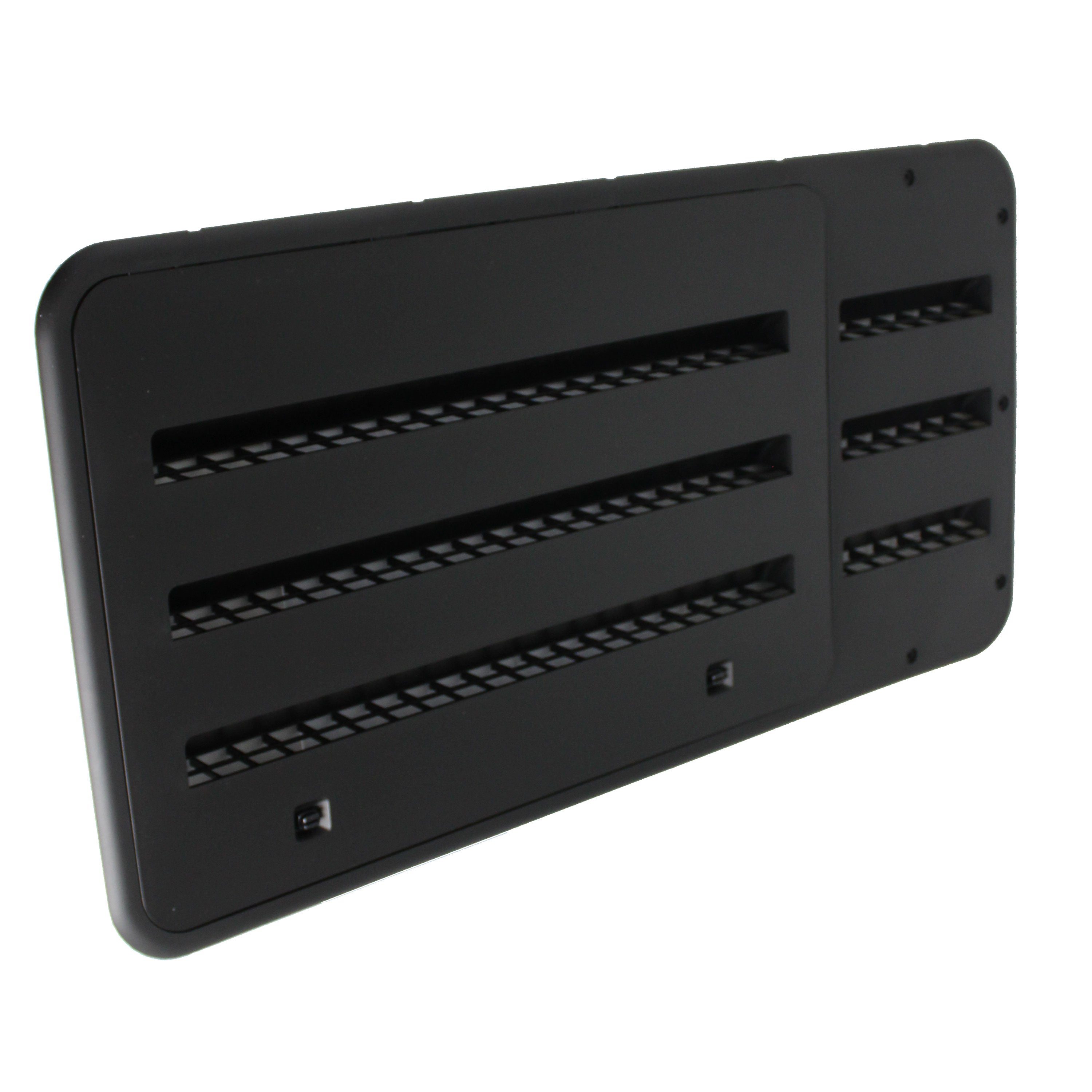 The Norcold 637318BK Refrigerator Vent is designed for use with Norcold 2118 series refrigerators. It offers a an upper exhaust, lower intake, and radius corners. Black plastic construction. Dimensions: 32.5" length x 18.75" width x 6.5" height. Cutout Dimensions: 29.3125" length x 13.75" height.
