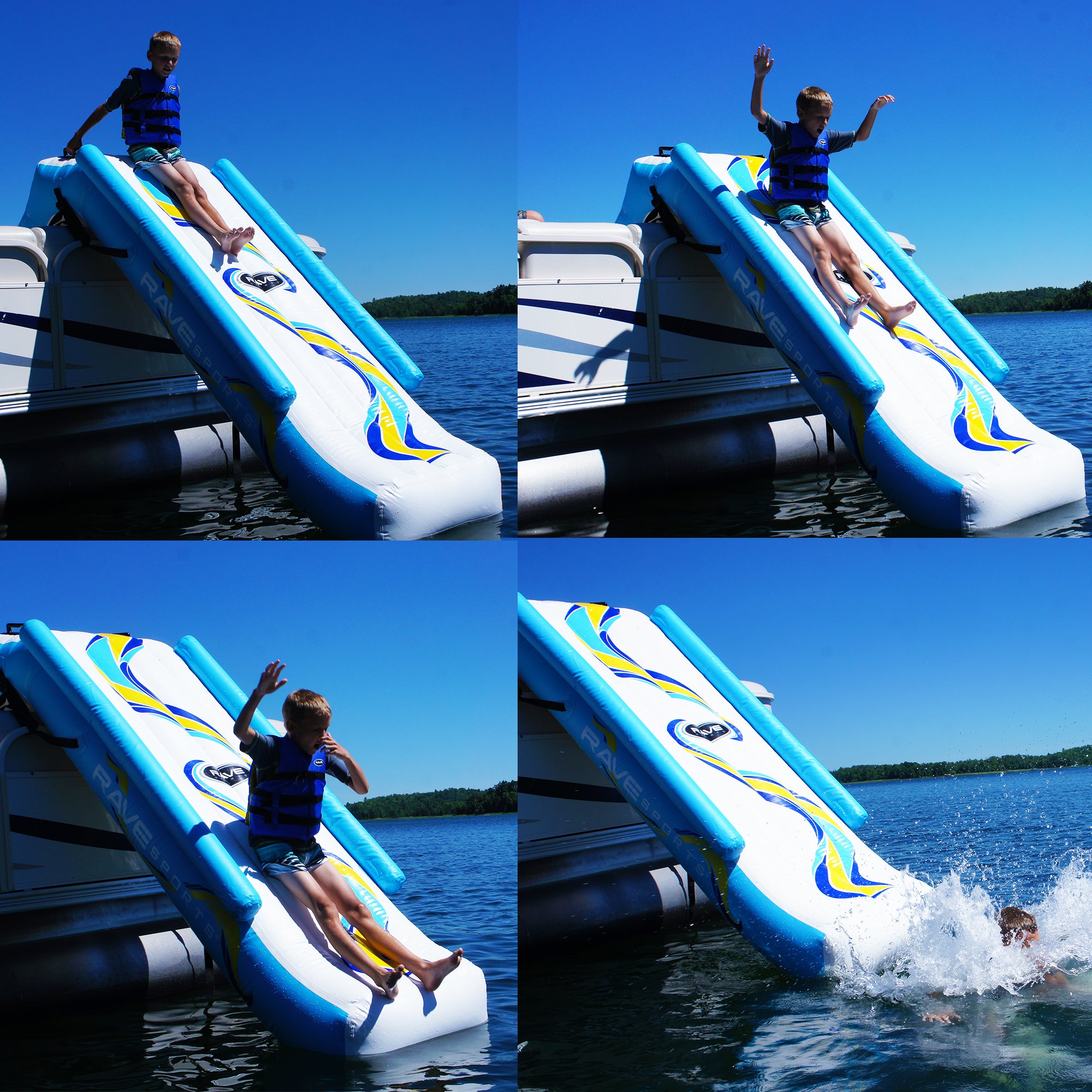 The Pontoon Slide features a 9' long, slick sliding surface, inflated side air chambers, four-inset vinyl molded footsteps, and two vinyl assist handles welded on the top. Once you've finished the fun, simply deflate and roll up for easy storage. Comes complete with a 12V high-pressure inflator/deflator that can run off the pontoon battery.