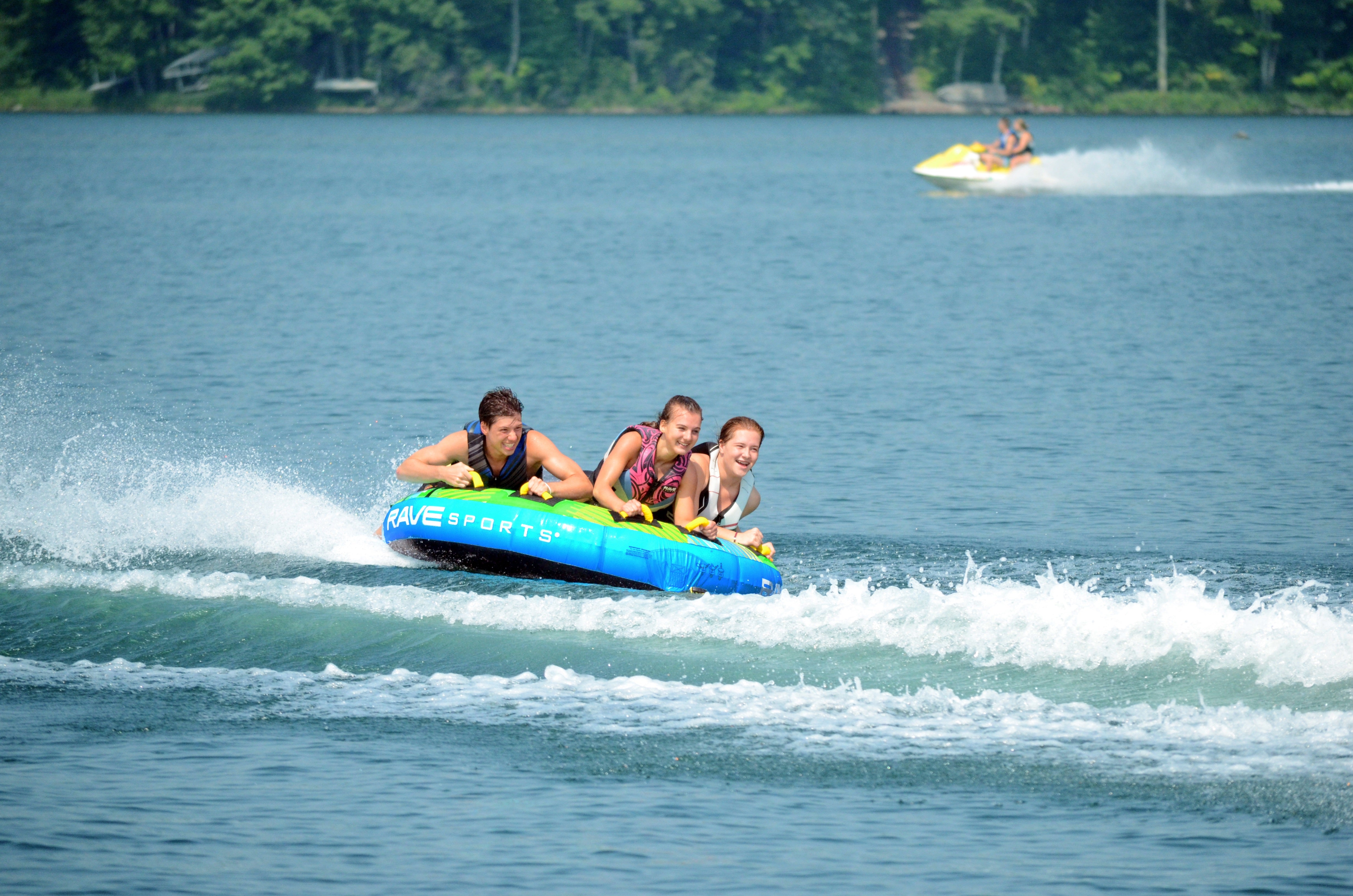 The GOAT (Greatest Outdoor Aquatic Towable) is a wily three-rider 68" diameter deck tube with a tapered profile for easy boarding and maneuverability. Featuring 600D polyester solution-dyed fabric cover that repels dirt, water and provides color fastness, a Slim-Fast bottom for a slick and fast ride that gets you up on plane quicker no Mater what boat you're towing with, twin rear boarding straps, two large EVA anti-chafe guards, and six deluxe foam-filled tubular handles with neoprene knuckle guards.