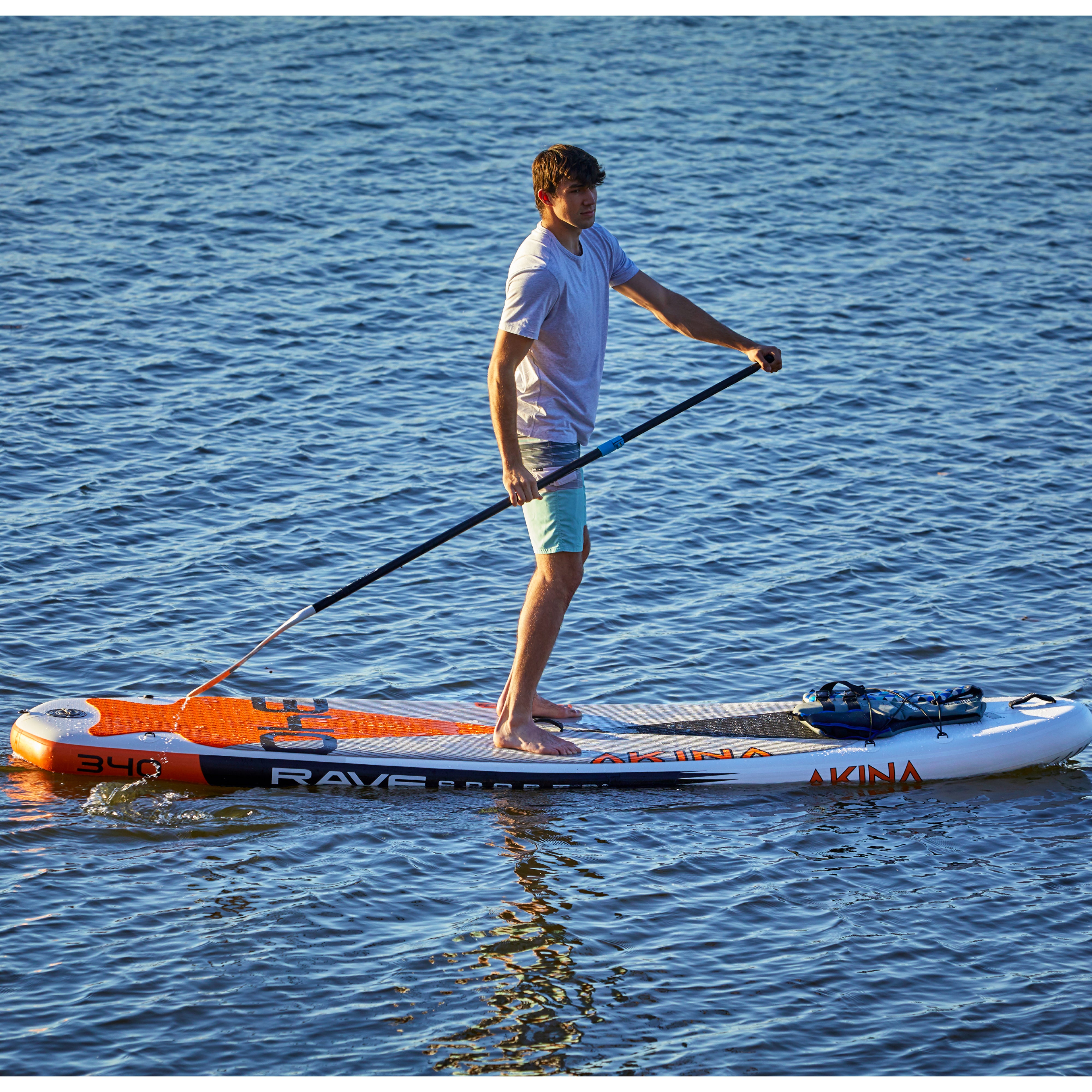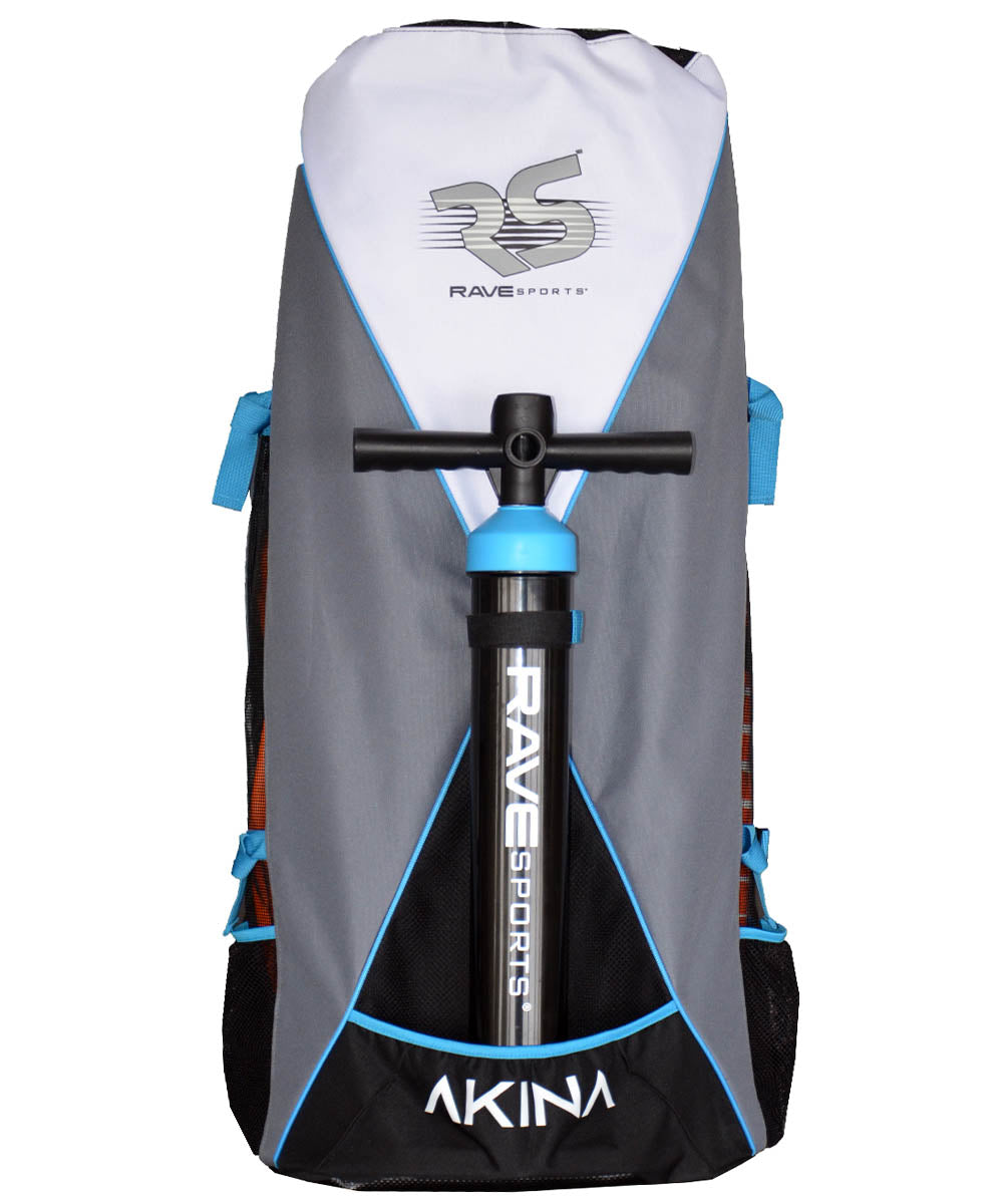 Extra wide for better balance. "Akina" is Ojibwe for "everything," so the new Akina 340 inflatable paddle board is the durable, portable, and storage iSUP for everyone and every SUP experience. With a wide and long non-slip deck pad, the Akina is a great option for all skill levels and paddling fun including taking along kids and dogs. Includes an easy fin system, cargo cords and versatile attachment points, reinforced nose and center handles, a backpack-style carry bag and a speedy dual action hand pump.