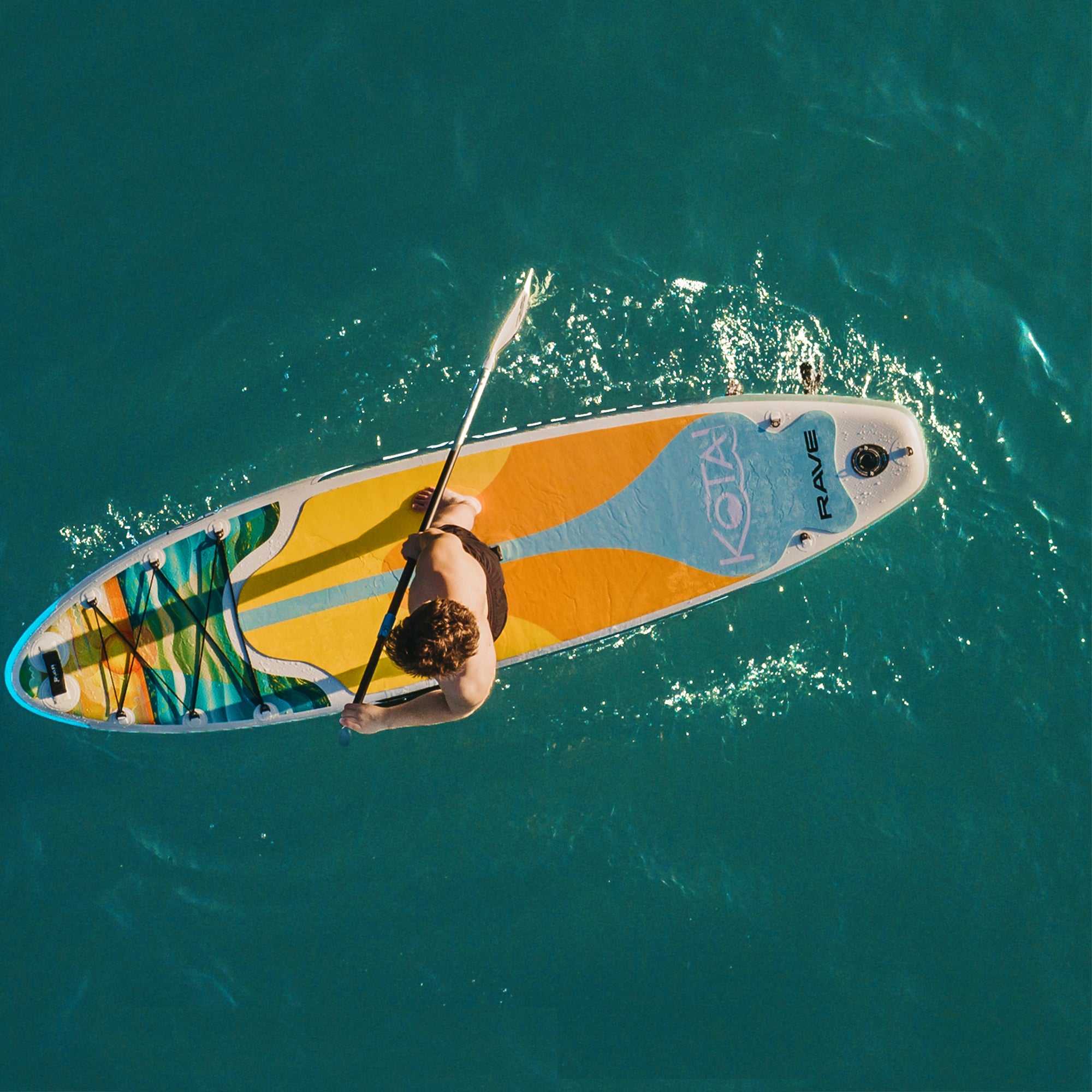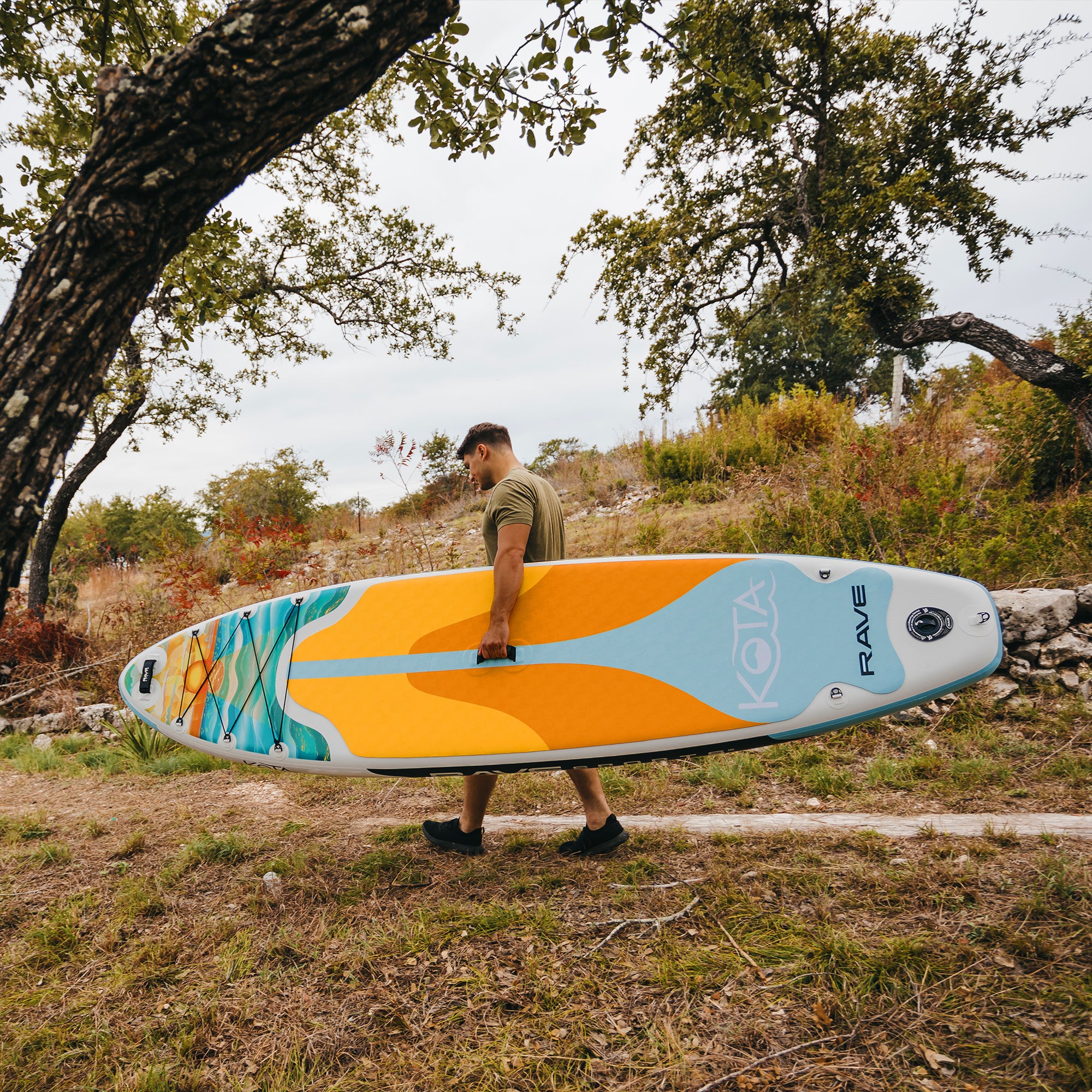 The KOTA Sunset inflatable paddle board package features graphics of a beautiful golden hour at the lake scene to inspire you to explore outdoor adventures. It's a versatile, stable, lightweight, and extremely durable inflatable SUP built to make sure your paddle adventures are always a great experience for all skill levels. Created with our Rigid Drop Stitch Air Beam Core construction for the ultimate in a durable, yet lightweight, inflatable paddle board. Each package includes: one KOTA iSUP, one quick release fin system with easy lever lock, one three-piece lightweight, durable paddle (adjustable length from 66" to 86" to fit most adults), one dual action SUP hand pump that inflates and deflates, one backpack-style carry bag with lots of extras including extra wide padded shoulder straps, one leg leash with padded ankle cuff, and one repair kit for convenient fixes of minor cuts and scrapes.