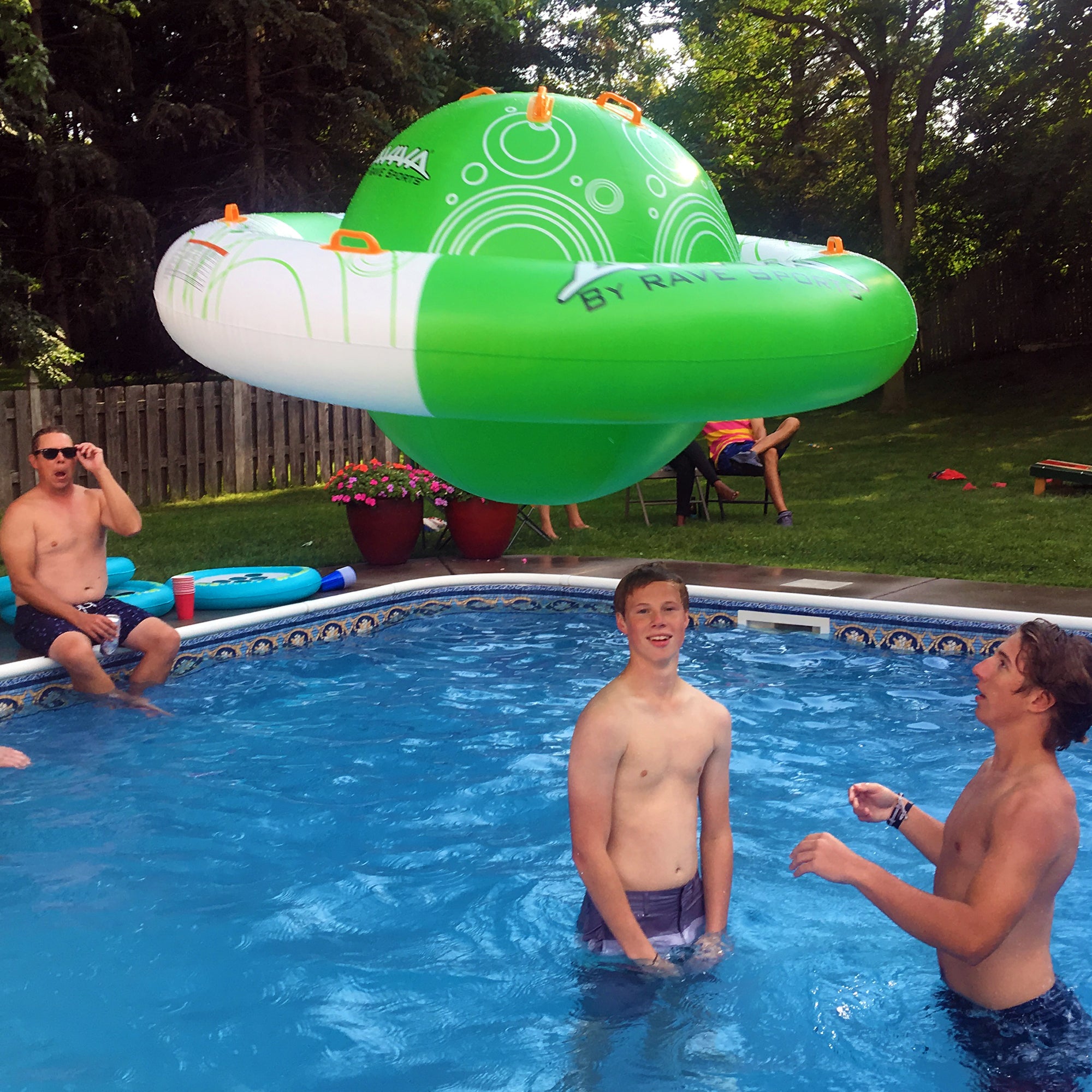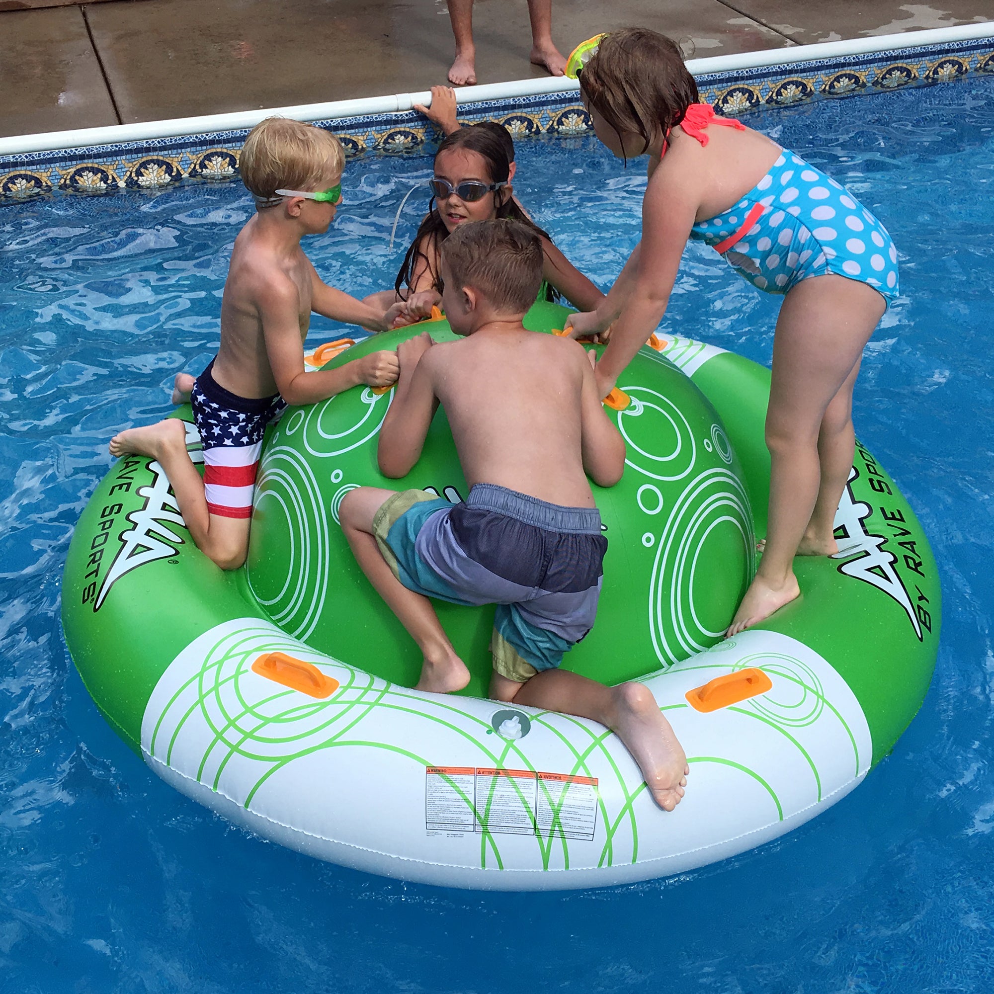 The Saturn Rocker inflatable children's pool toy is perfect for use in a pool or lake and constructed of durable 12 gauge PVC vinyl. The Saturn Rocker also features 2 air chambers, 8 handles, and 1 anchor point. 5' water depth required. 240 lbs. max user weight. Recommended for ages 6-12. 64" x 64" x 35" inflated.