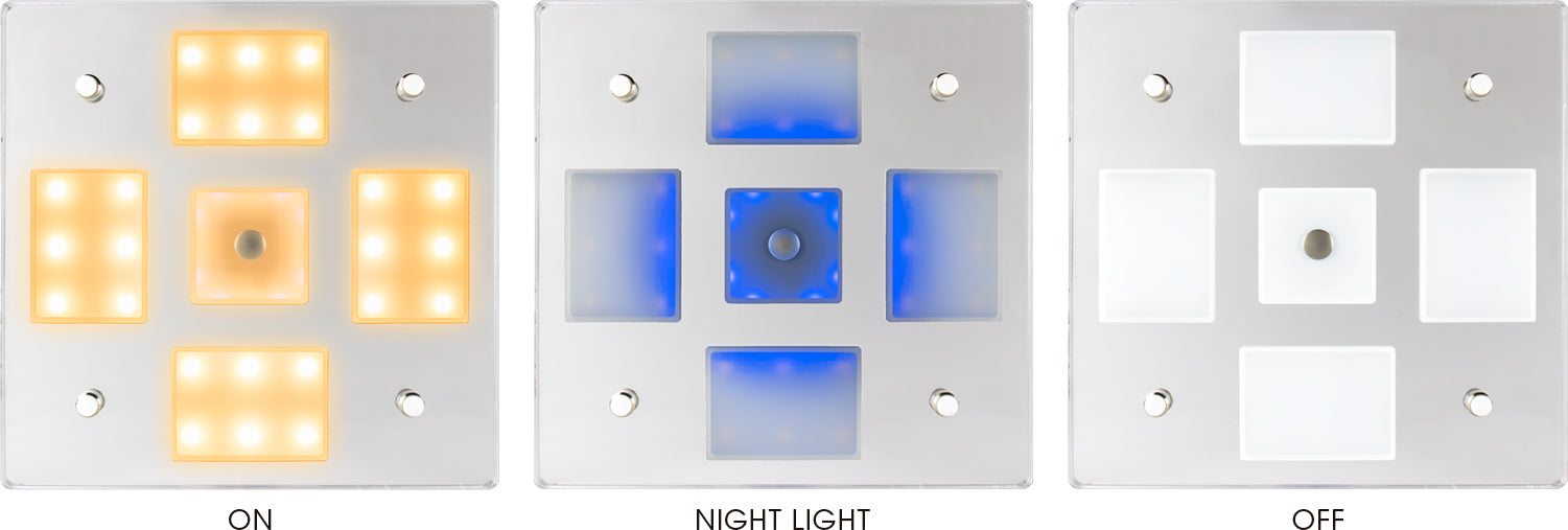 This LED Square Mirror Light features white and blue LED lights with a built-in, touch controlled on/dim/off switch. Touch the center button to switch between white, blue, and off. Continue to touch button to activate dimmer. 3000K warm white, 24 Osram LEDs, 1000 lumens @ 6W. Works with 12V and 24V systems. Includes four #6 FH fasteners and white hole plugs. CE, RoHS compliant.