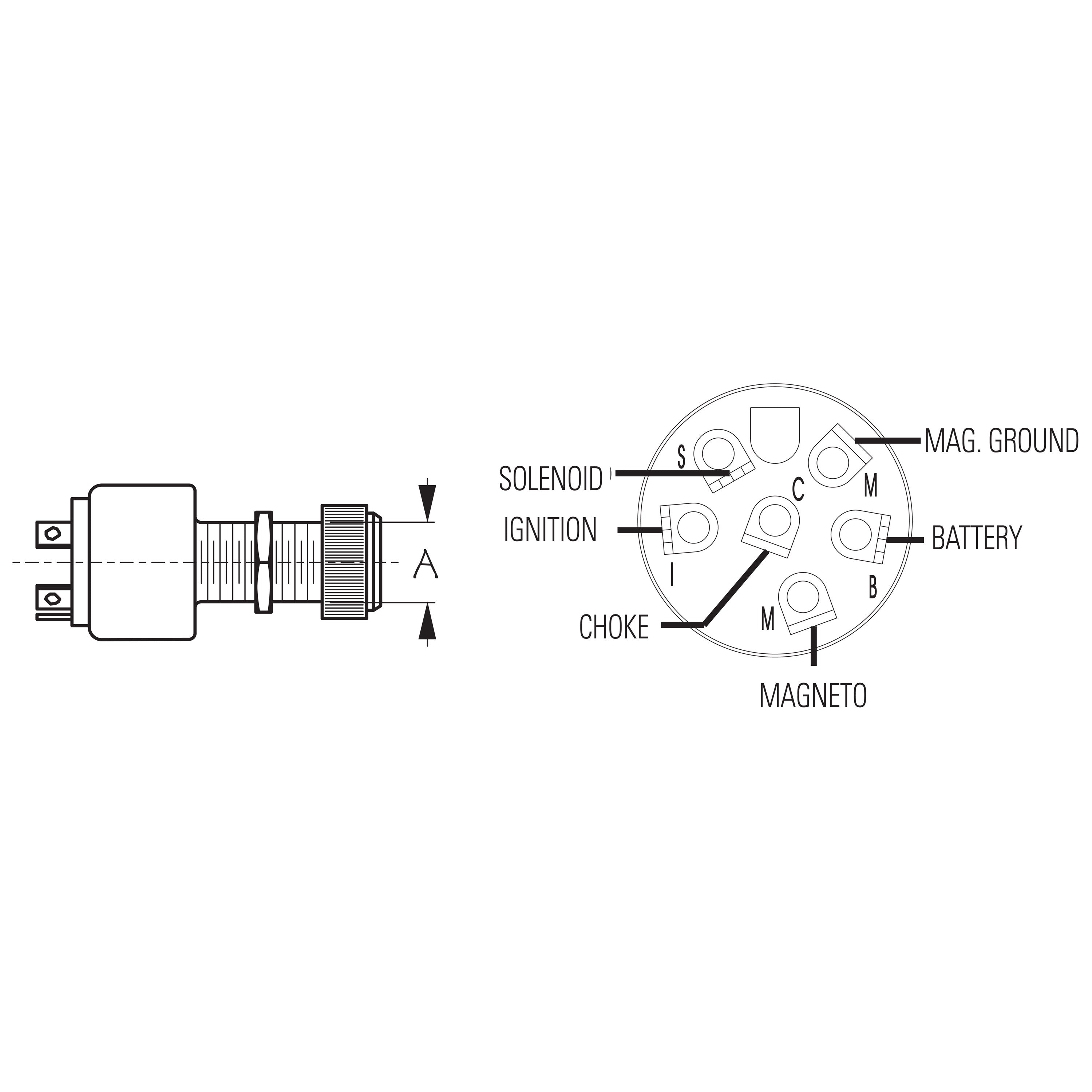 Three-Position Magneto-Style Ignition Switch for off, ignition, start, and choke functions. 13/16" diameter short shaft for a maximum panel thickness: 5/8. Six screw or five screw plus one boss terminal electrical connection. Ignition: 15A @ 12VDC. Solenoid: 30A @ 12VDC. Choke: 7A @ 12VDC. Constructed of polypropylene. Includes two keys. Push to choke.