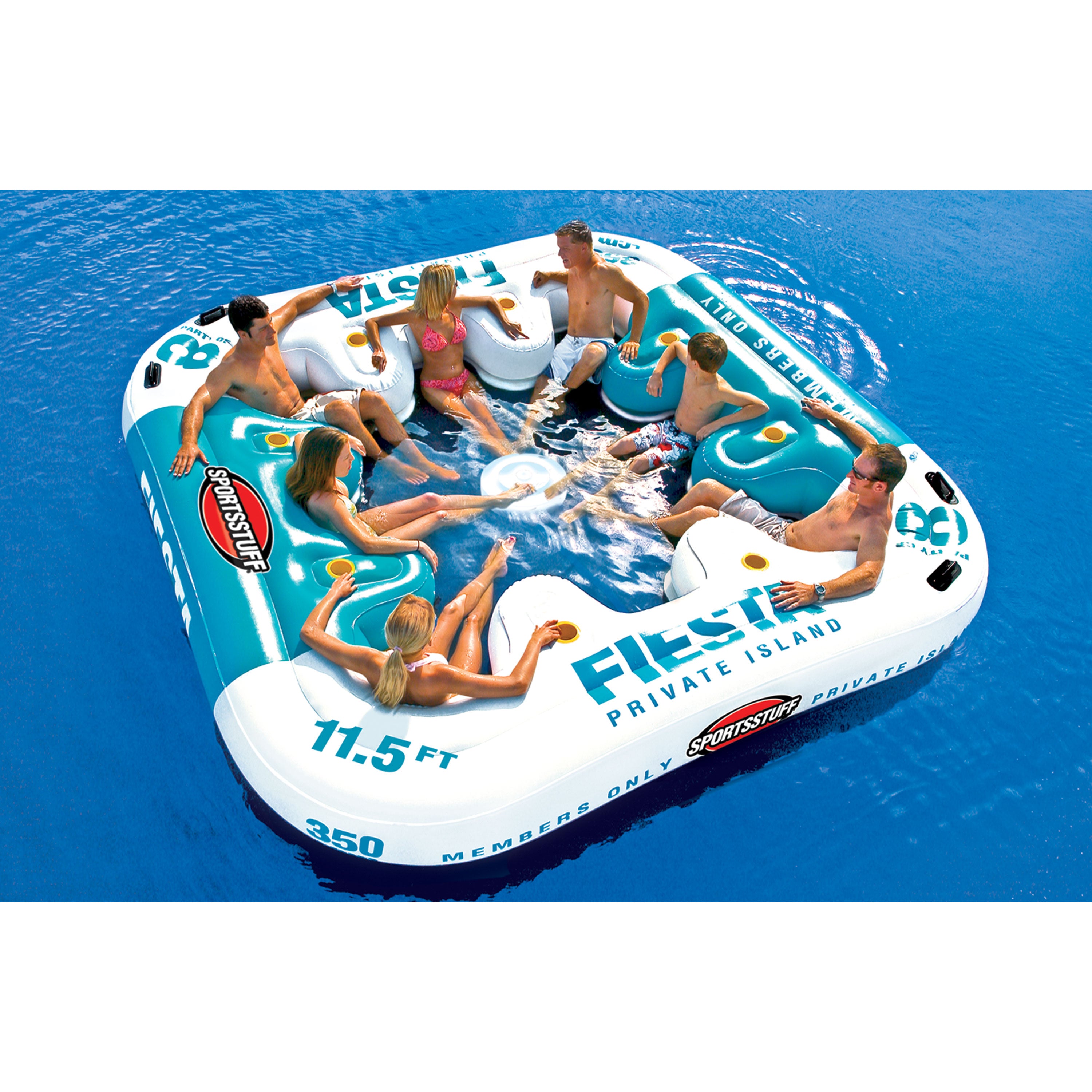 Party in the water, party off the water! The Fiesta Private Island has room for 8 with cup holders all around and a comfortable mesh bottom surface. Sitting on the mesh you can enjoy the inflated contoured backrests in the water, or sit on the floating platform portion and just let your toes go for a dip. The new and improved construction now includes a central air chamber for extra support. The Fiesta is a party and anything goes!